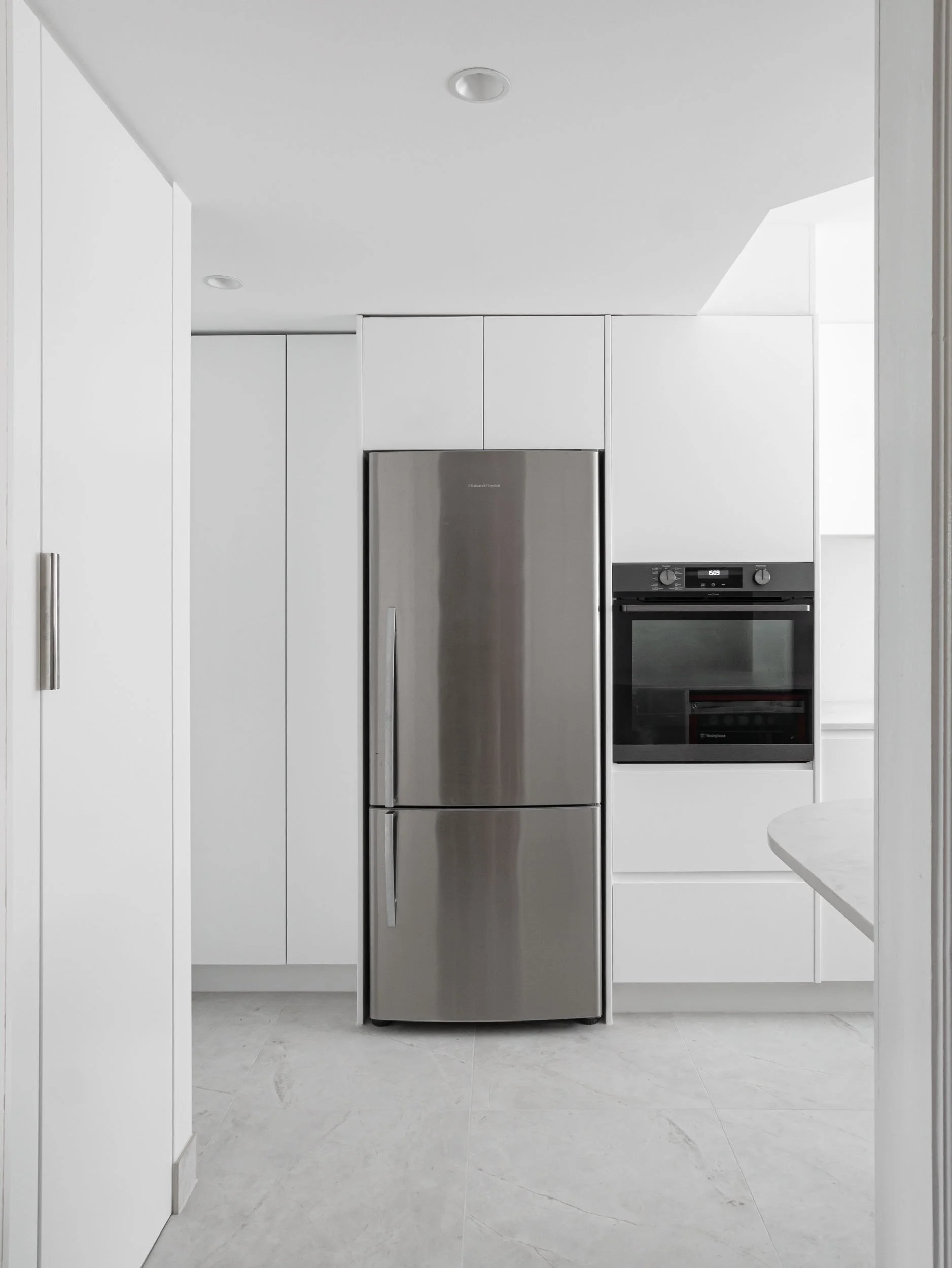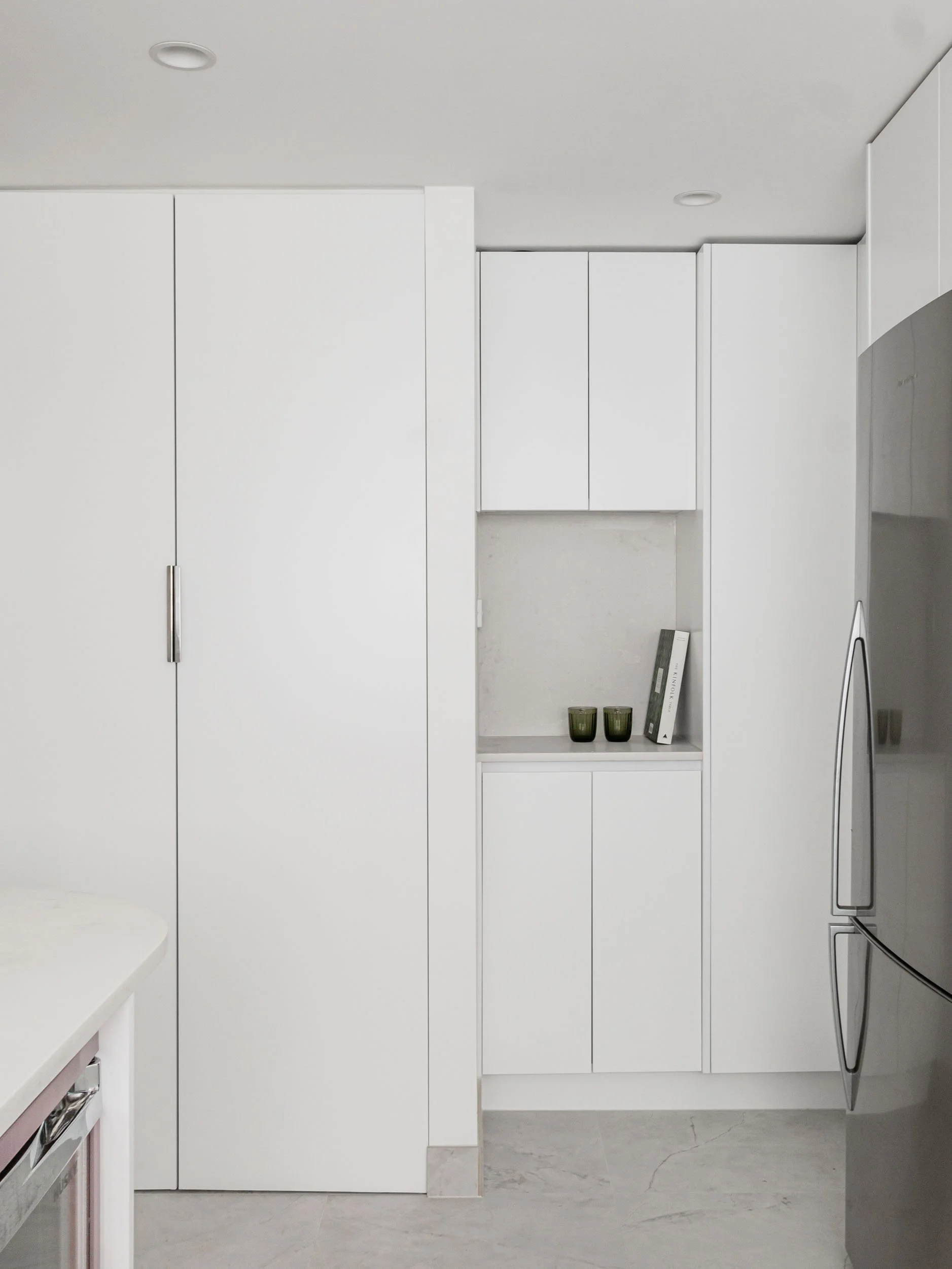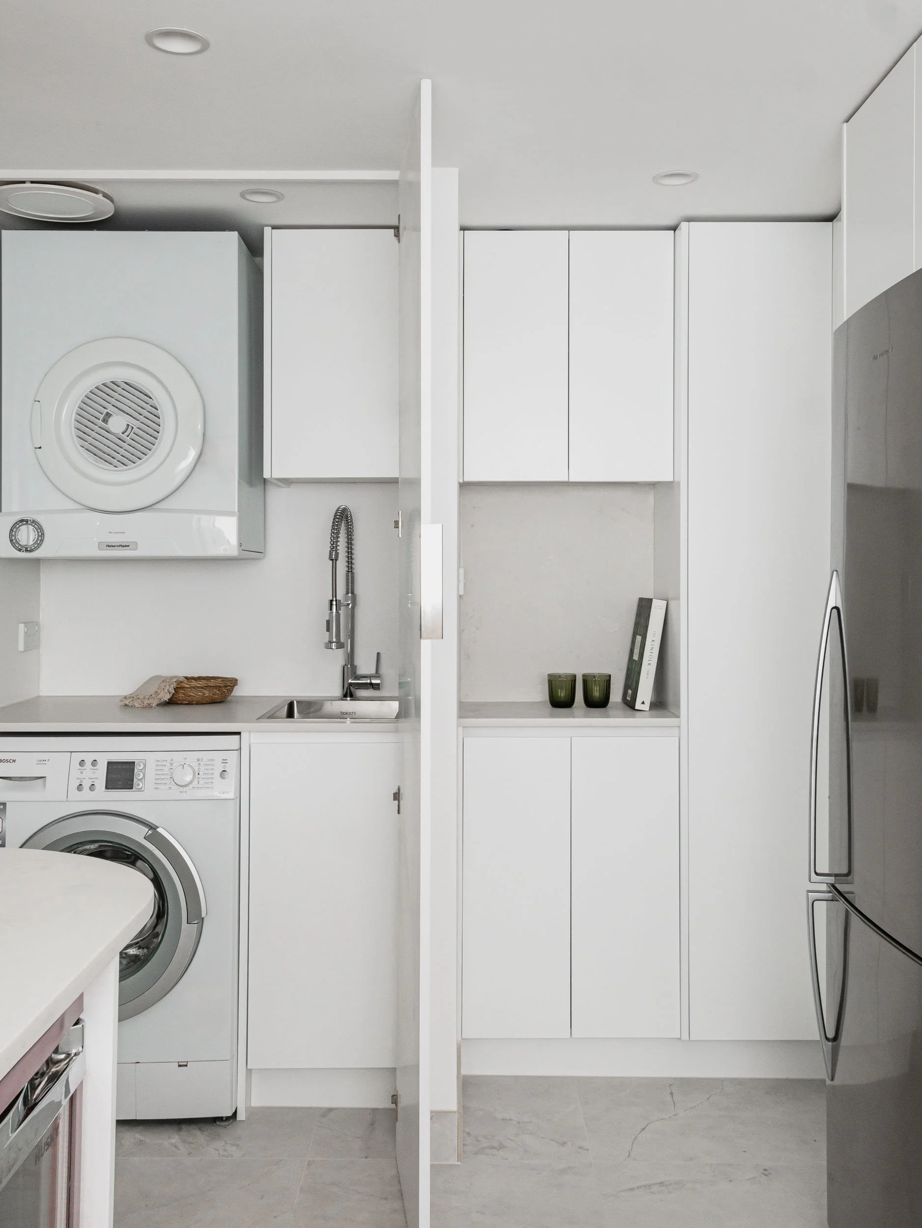 We meticulously crafted a layout to amplify cabinet storage and ease of use, integrating a practical laundry area that melds seamlessly with the kitchen's new elegance.